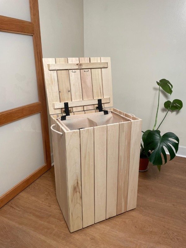 Además, cuenta con manijas para un transporte cómodo y una tapa que ayuda a mantener los olores a raya. Todos sus modelos incluyen una funda de tela ecológica y lavable, disponible con o sin división, según el tamaño que elijas.
