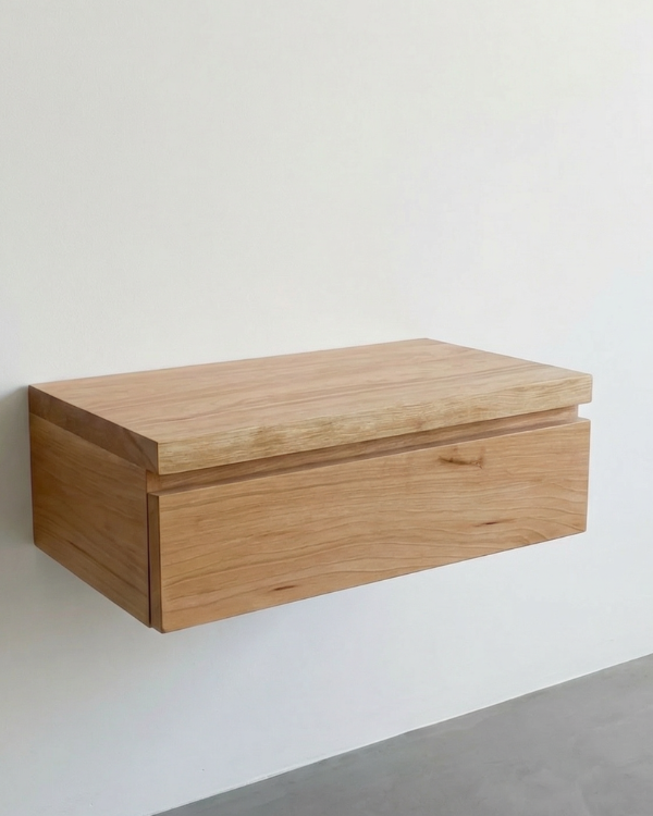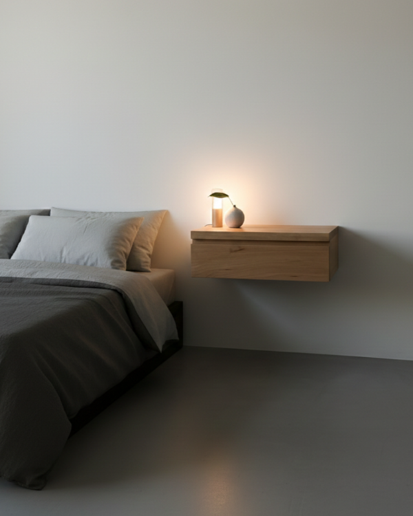 KANTAI es una mesa de luz flotante. Su diseño minimalista despeja el espacio visual y aporta una sensación liviana y ordenada al dormitorio.